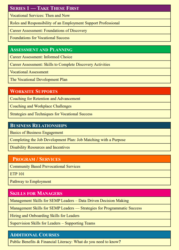 This project is a free, statewide training program in partnership with the New York State Office for People With Developmental Disabilities to educate direct support professionals, job developers, job coaches, and managers of employment opportunities as they support people with intellectual and developmental disabilities to fully participate in their communities through employment.